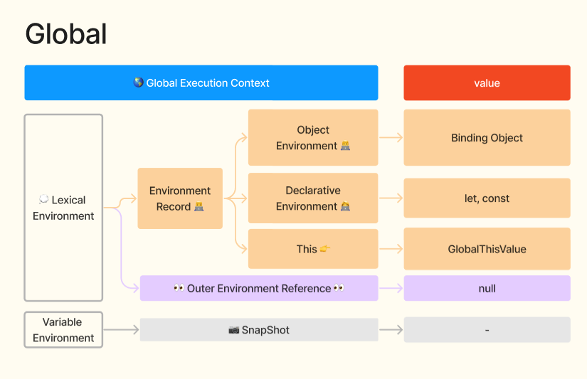 - Lexical Environment - 식별자와 변수의 스코프를 정의하는 환경. 실행 컨텍스트에 포함되어 있고 현재 코드의 컨텍스트를 정의한다.