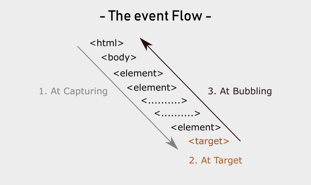 <element>를 클릭하면 이벤트가 최상위 조상에서 시작해 아래로 전파되고(캡처링 단계), 이벤트가 타깃 요소에 도착해 실행된 후(타깃 단계), 다시 위로 전파된다.(버블링 단계).