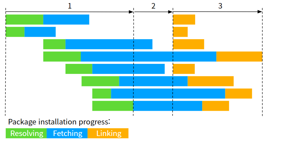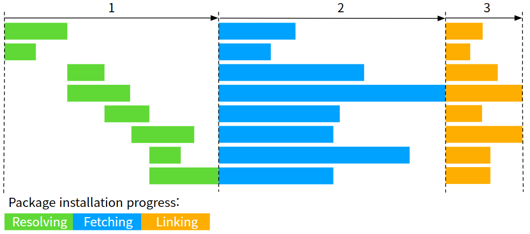 이 접근은 다른 패키지 관리자의 전통적인 3-단계 설치 과정(의존성 해결resolving, 수정fetching, node_modeules에 작성(Linking))보다 현저하게 빠르다
