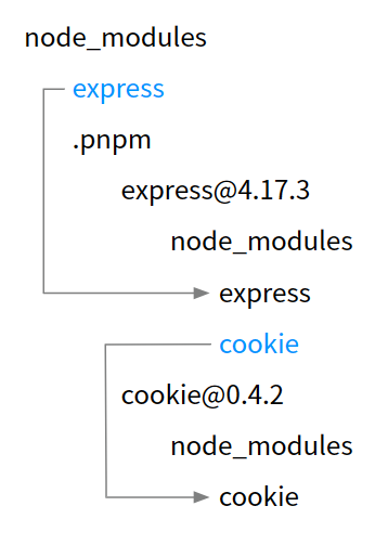 다음 폴더 구조를 참고하자. 소스 코드가 직접적으로 의존하는 express만이 최상위 node_modules 디렉터리에 위치해 있고, cookie는 express 내부에서만 접근할 수 있다. 이는 의존성 충돌을 방지하고 패키지 간의 명확한 의존성 관계를 유지하는 데에 도움이 된다.