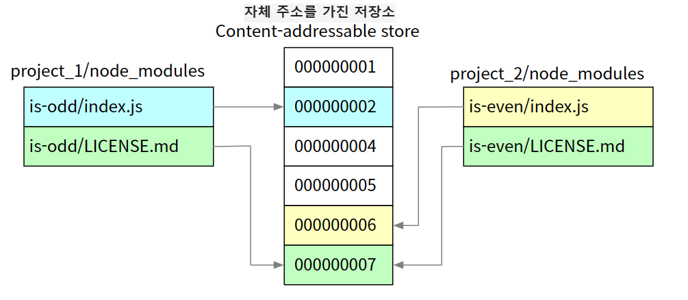 npm을 사용할 때 종속성을 사용하는 프로젝트가 100개 있는 경우 해당 종속성의 사본 100개가 디스크에 저장된다. 그러나, pnpm을 사용하면 의존성이 content-addressable 저장소에 저장되므로, 다음 단계가 진행된다.